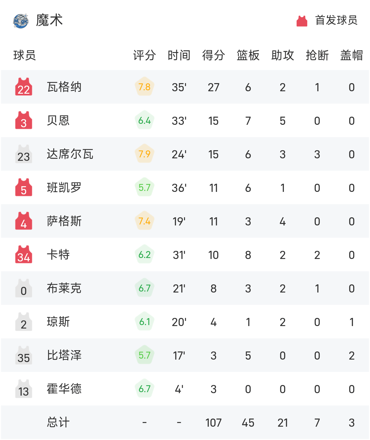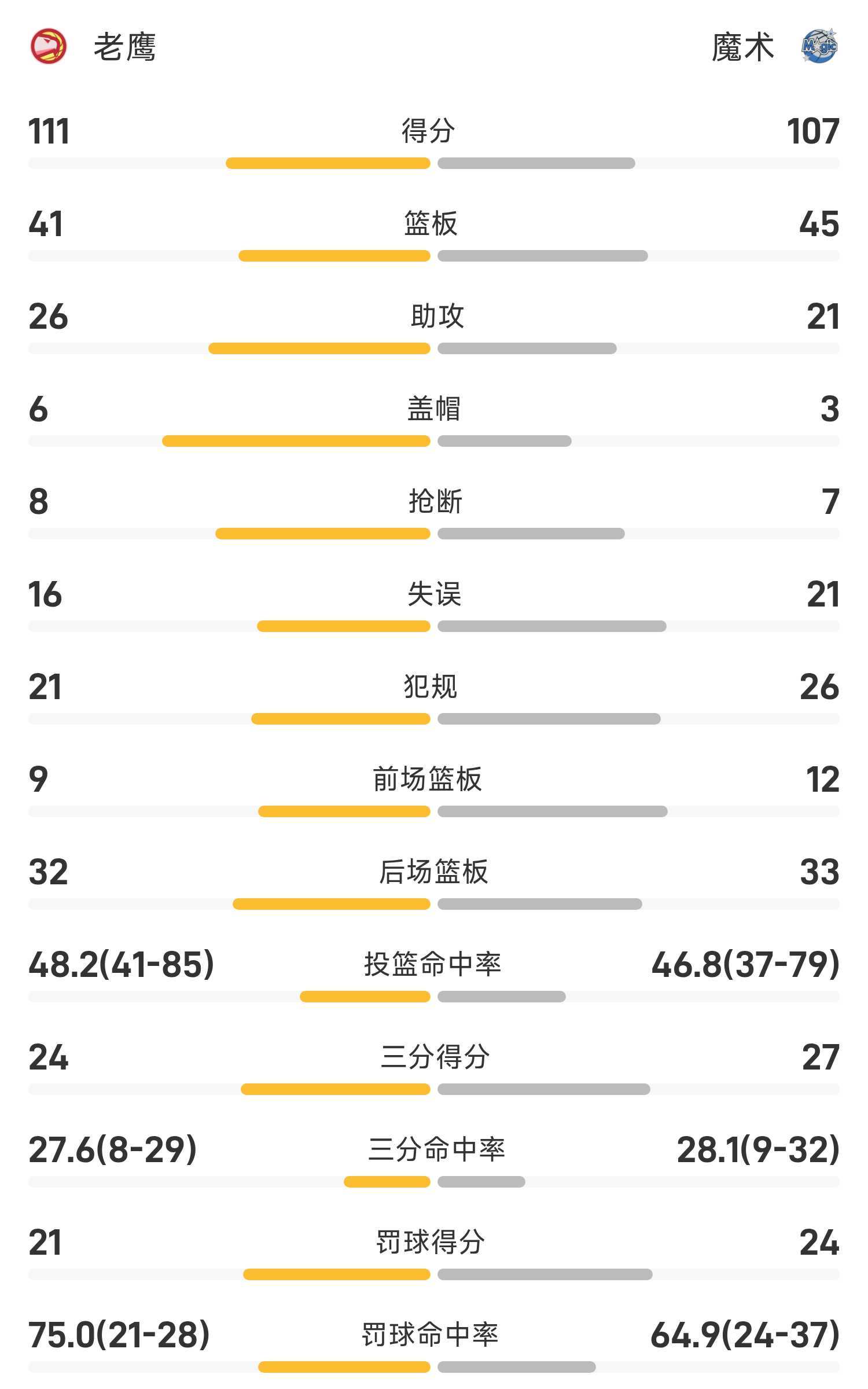 6686体育10月25日讯 25/26赛季NBA 常规赛,魔术对阵老鹰。双方全场战罢,魔术107-111不敌老鹰。特雷杨得到25分1板6助率队取胜,瓦格纳空砍全场最高的27分6板2助。