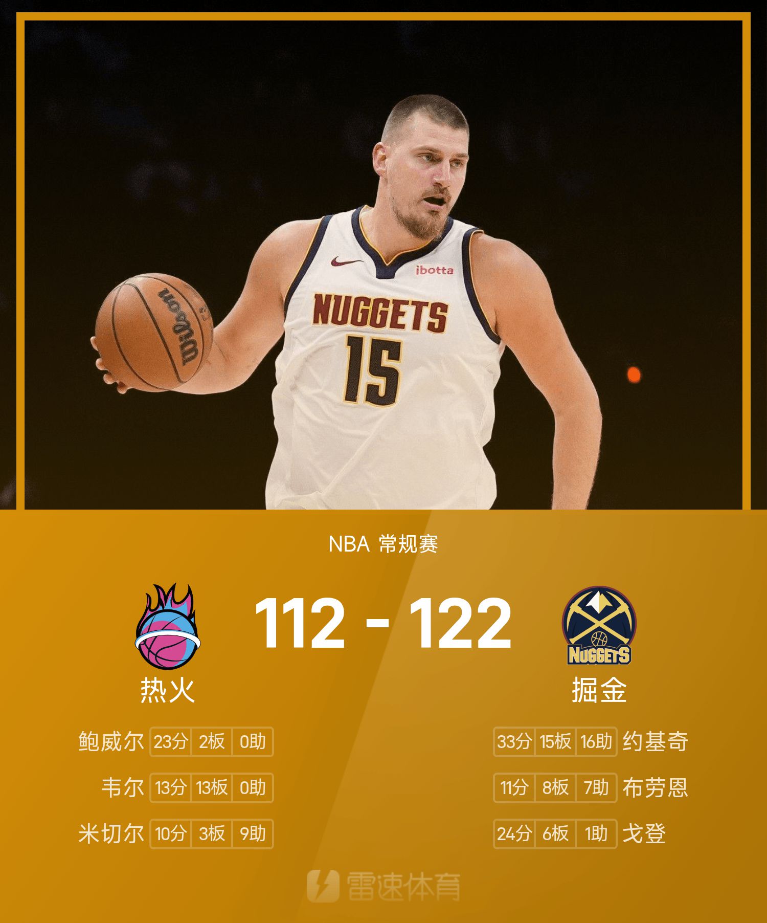 NBA战报:约基奇33分15板16助,掘金122-112击败热火