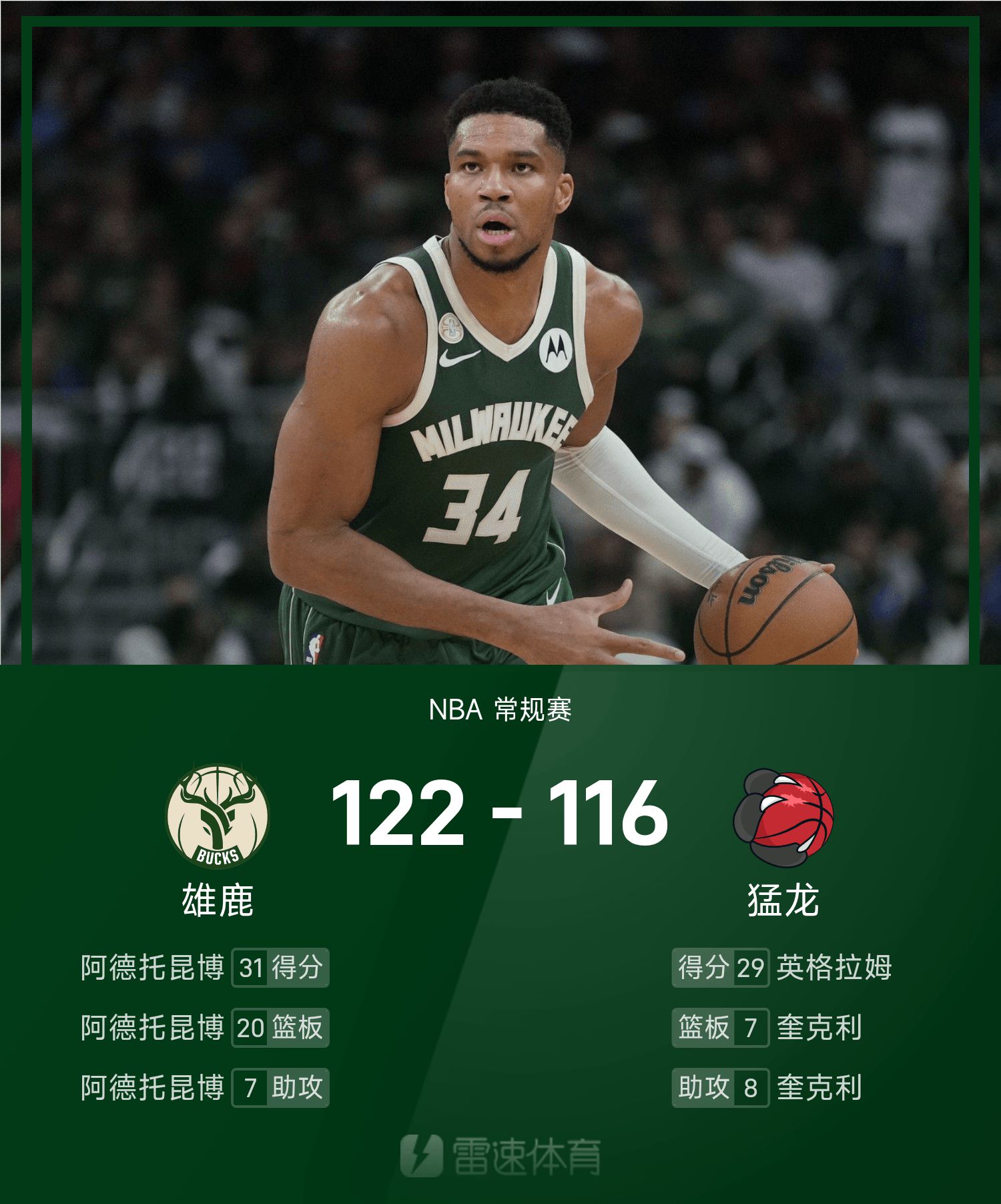 字母哥14投11中,得到31分20抢篮板7助攻。