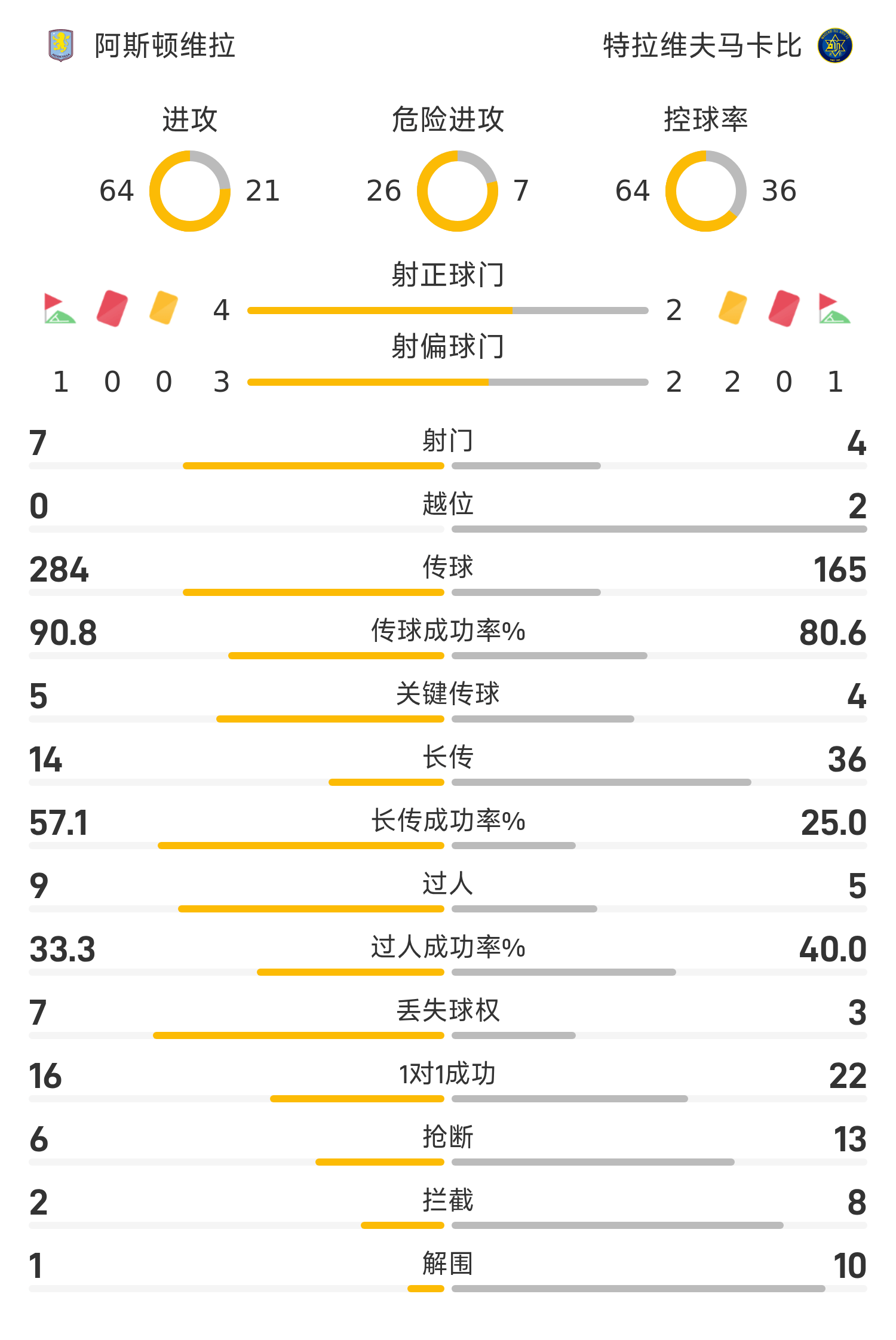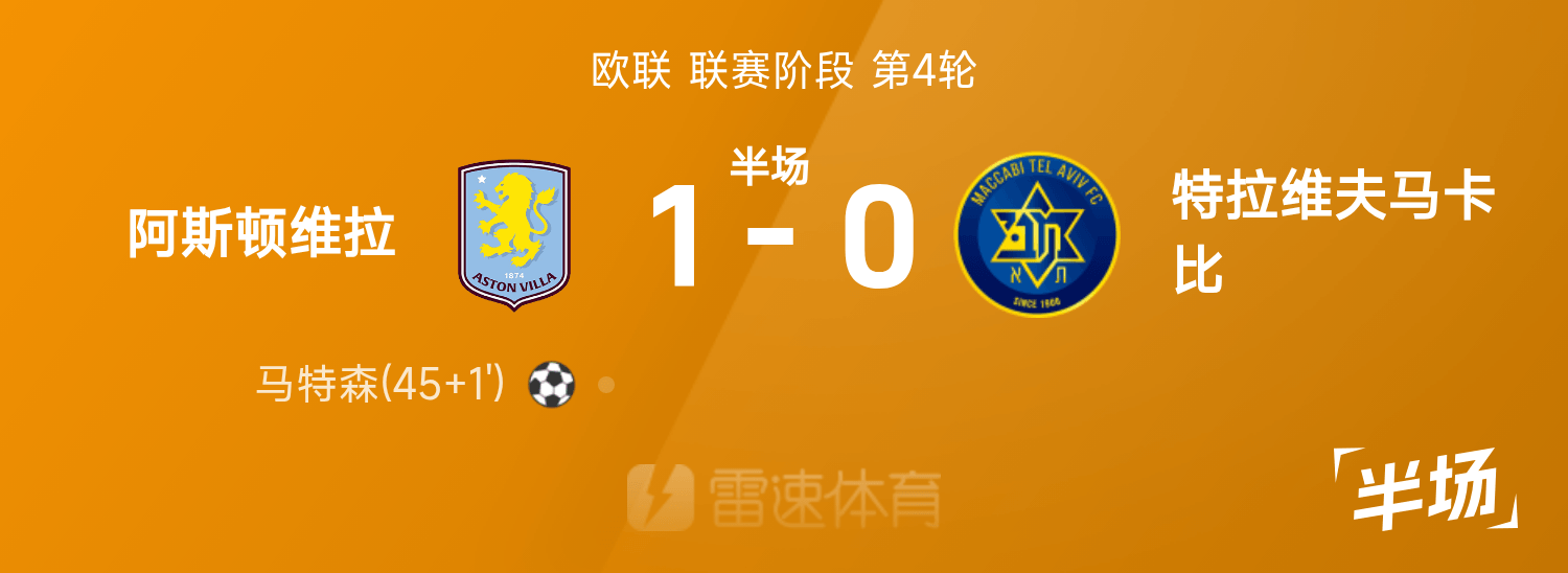 欧联半场:马特森破门,大马丁献神扑,维拉1-0特拉维夫马卡比