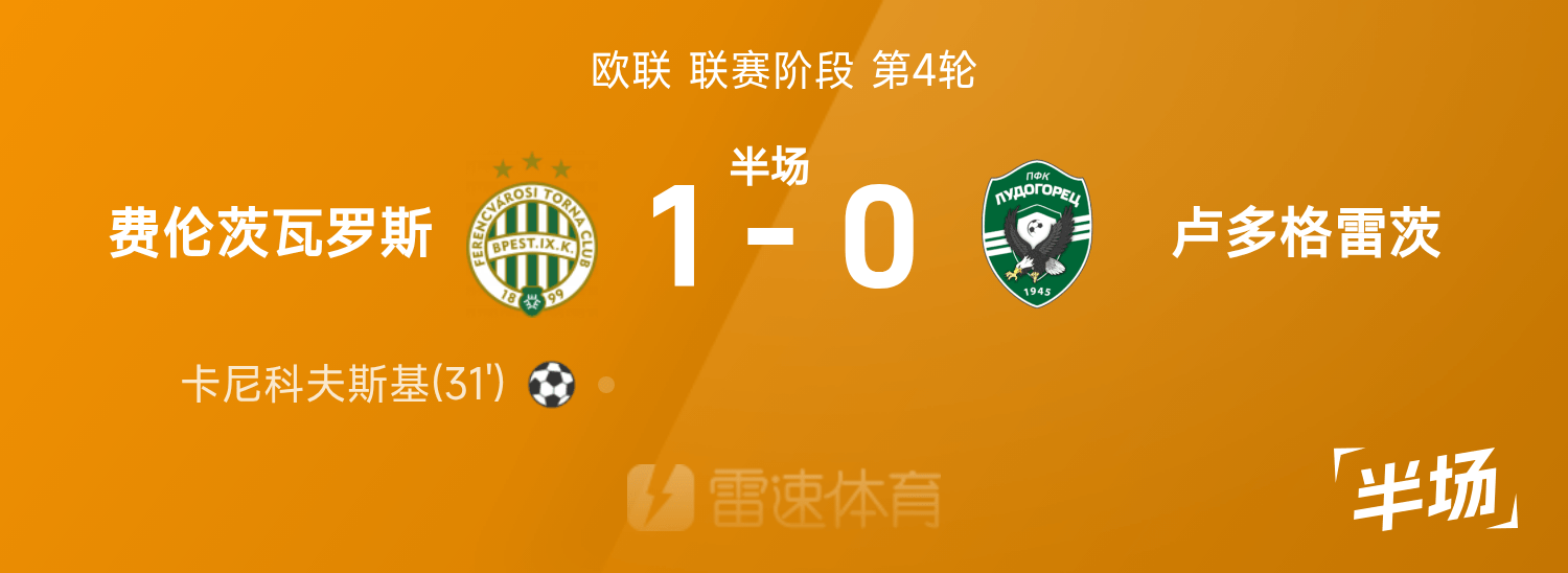 欧联半场:卡尼科夫斯基破门,费伦茨瓦罗斯1-0卢多格雷茨