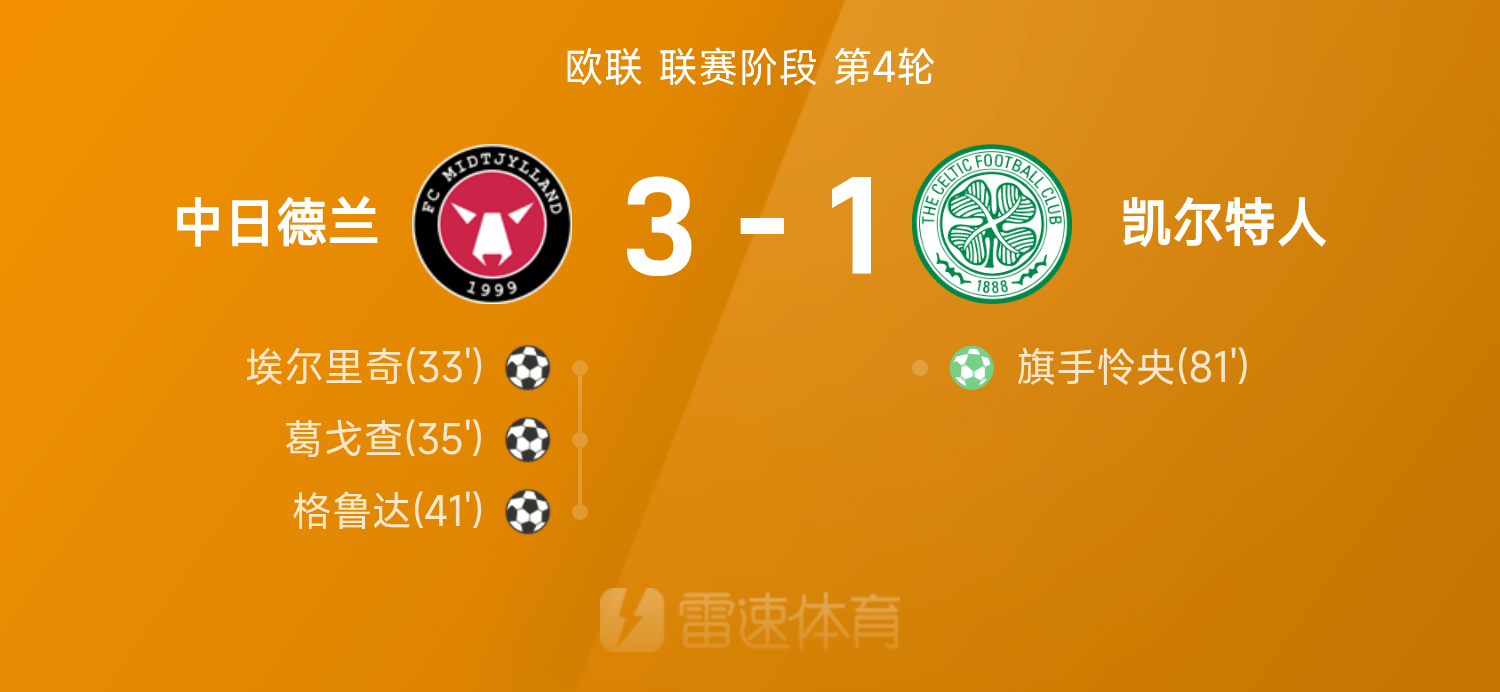 欧联战报:葛戈查1射1传,中日德兰3-1战胜凯尔特人