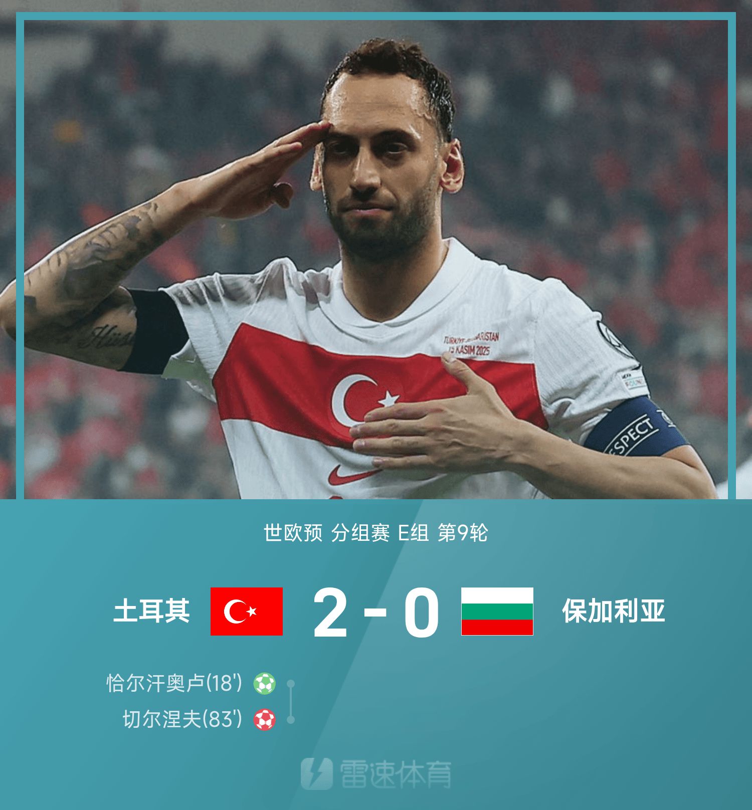 世欧预战报:恰尔汗奥卢点射,土耳其2-0力克保加利亚