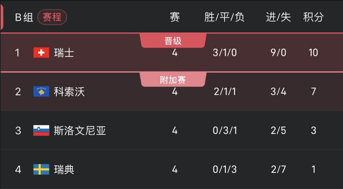 瑞士若击败瑞典,且科索沃未能战胜斯洛文尼亚,即可出线。