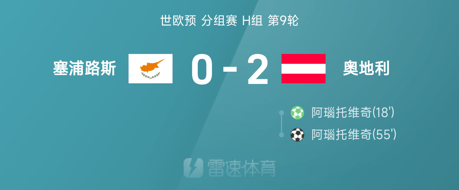 55’阿瑙托维奇双响,奥地利暂2-0领跑位塞浦路斯