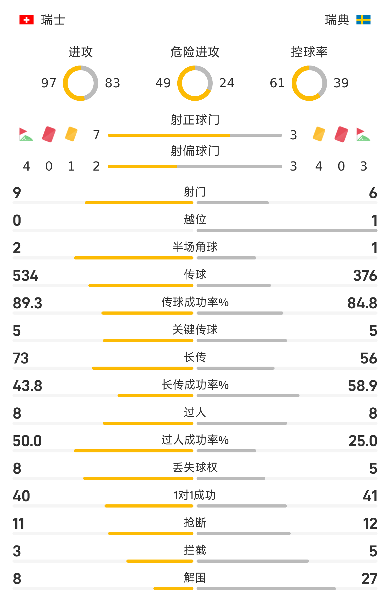 瑞士首发阵容:1-科贝尔、13-罗德里格斯(70’2-穆海姆)、3-威德默、4-埃尔维迪、5-阿坎吉、10-扎卡、20-阿比切尔、17-巴尔加斯(85’16-法斯纳赫特)、22-里德尔(70’15-索乌)、11-恩多耶(90’14-泽齐利)、7-恩博洛(85’9-曼赞比)