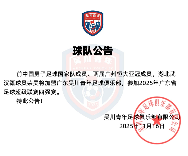 前中国男子足球国家队成员、两届广州恒大亚冠成员,湖北武汉籍球员荣昊将加盟广东吴川青年足球俱乐部,参加2025年广东省足球超级联赛事四强赛。