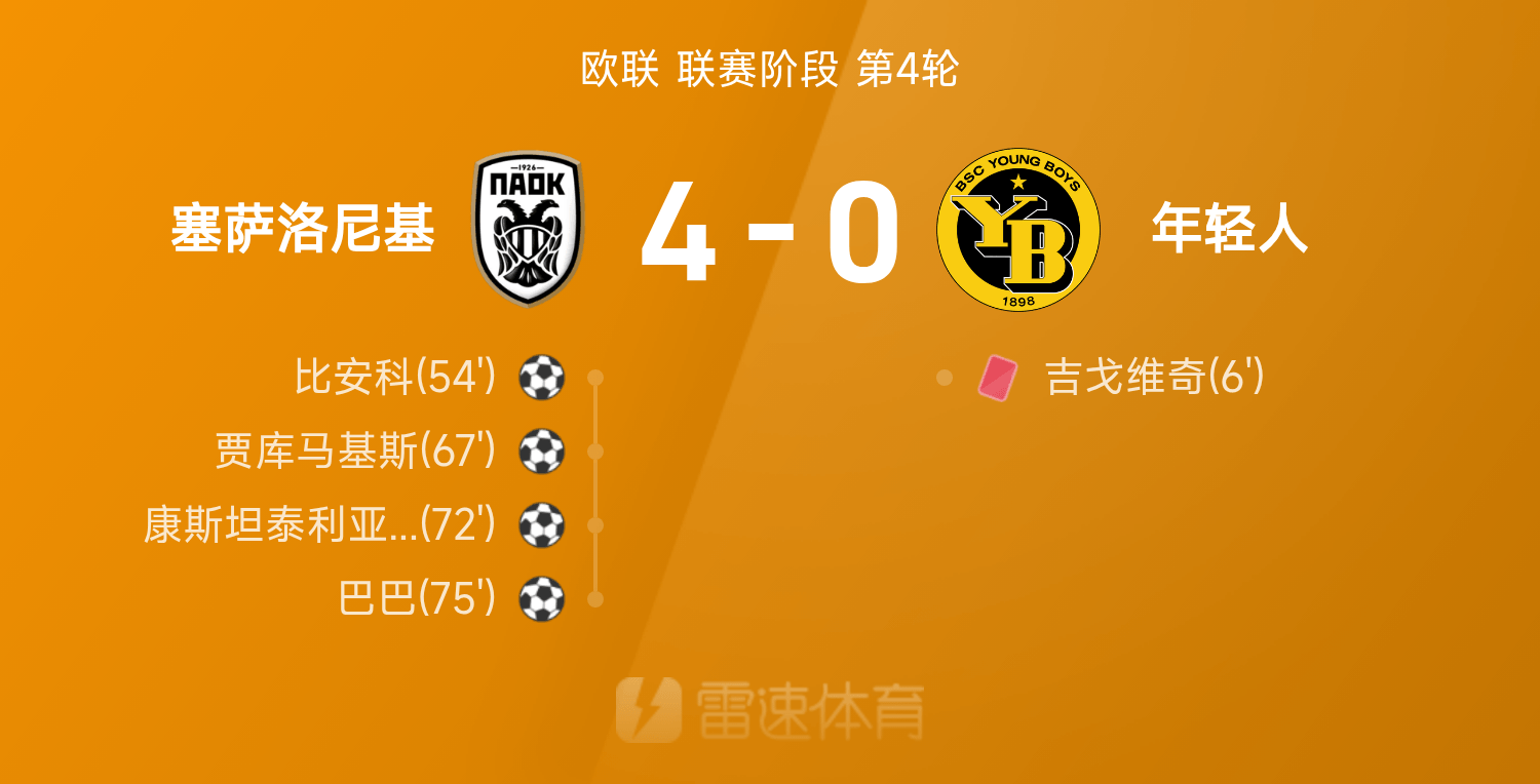 欧联战报:巴巴1射1传,塞萨洛尼基4-0大胜年少人