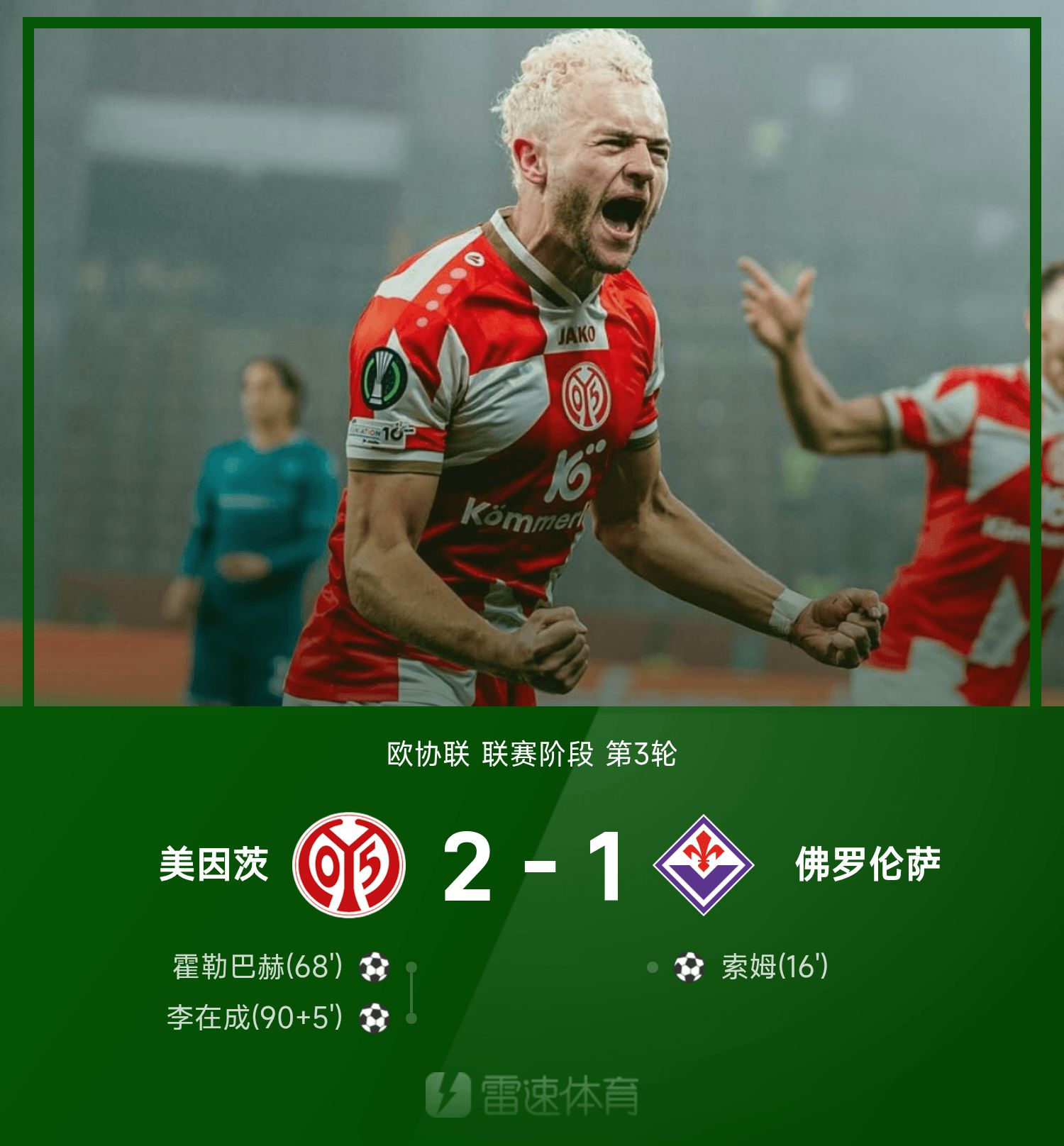 欧协联战报:李在成顶球最后一投,美因茨2-1佛罗伦萨