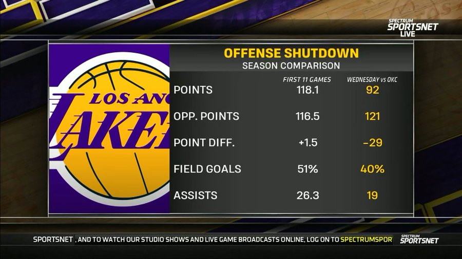 赛后,美国电视台将湖人本场竞赛的数据和赛季前11场竞赛的数据进行对比,各项数据全面下滑。