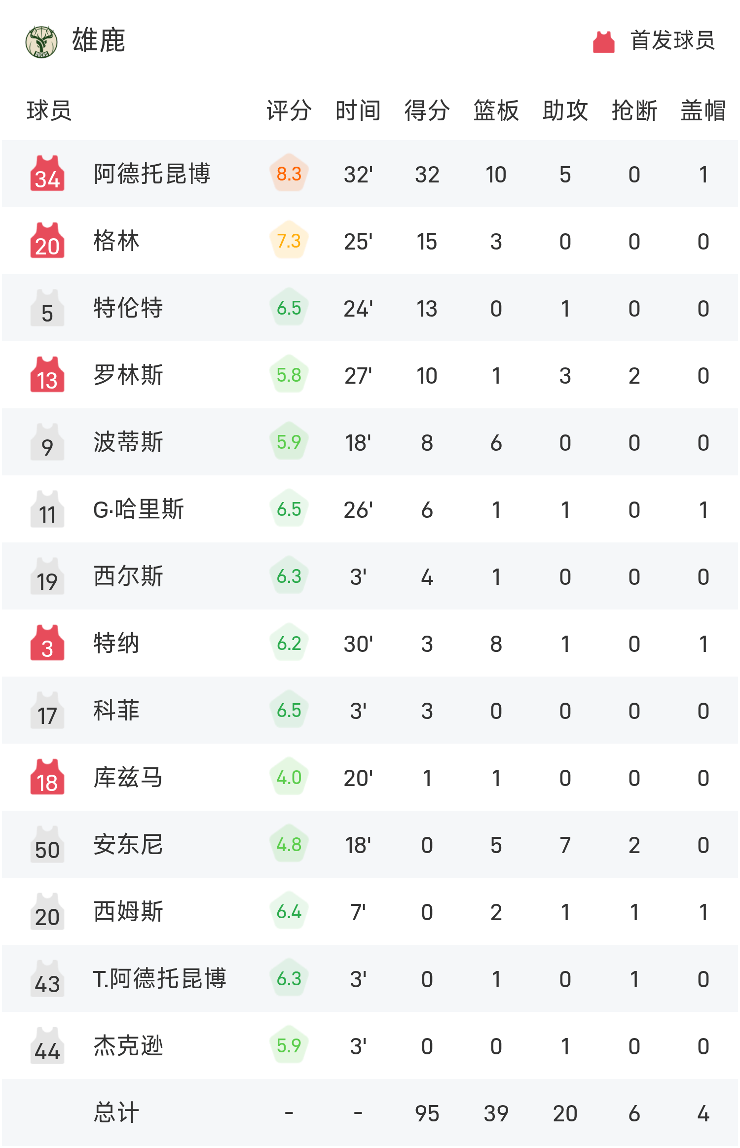 双方全场战罢,雄鹿95-119不敌湖人。