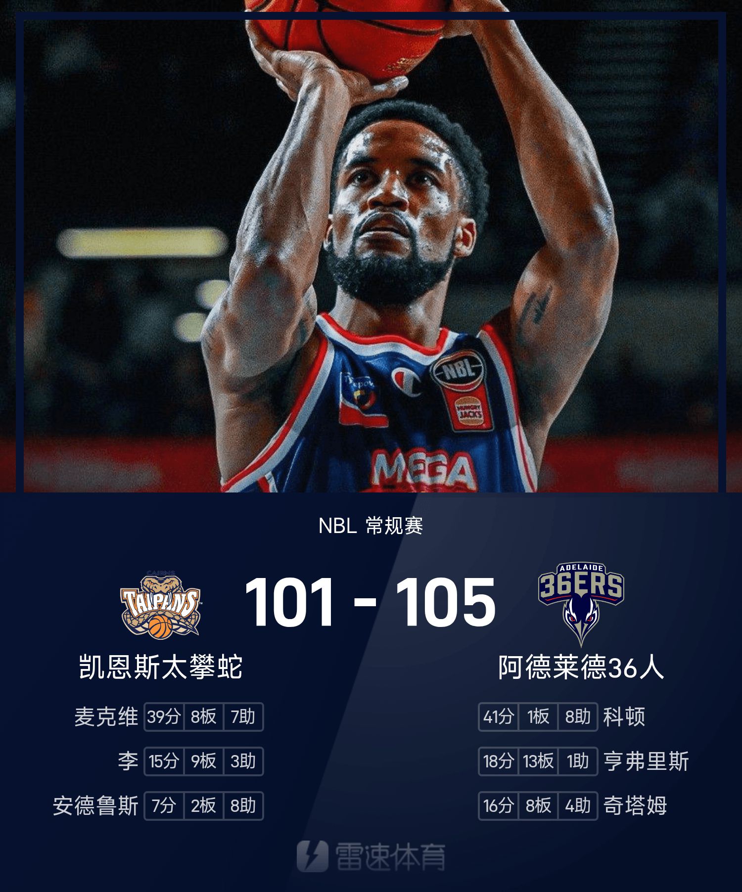 科顿砍下全场最高的41分1板8助,率领阿德莱德36人胜利取胜。