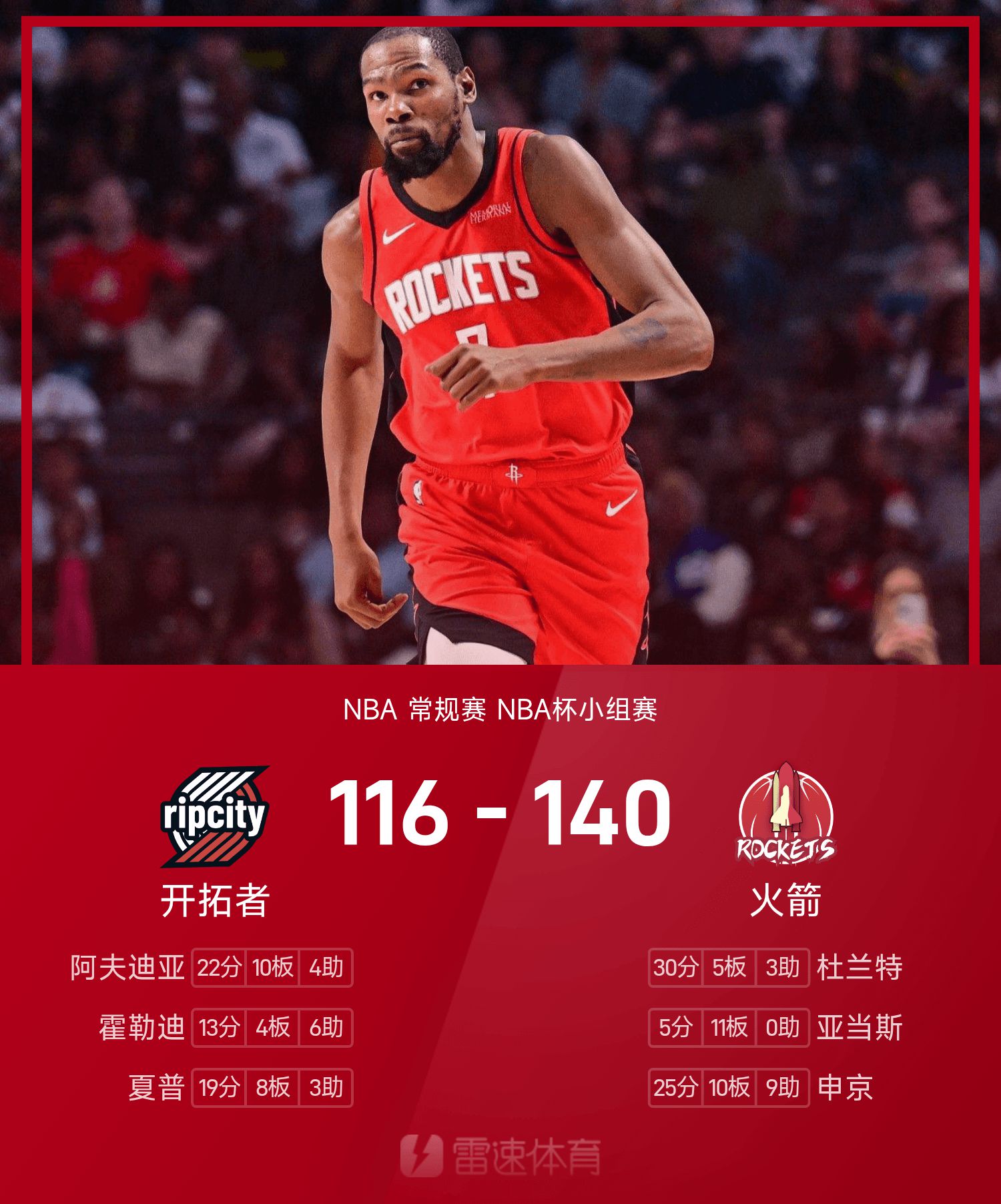 正负值+37,杜兰特高效砍下30分5抢篮板3助攻,率领火箭轻取开拓者。