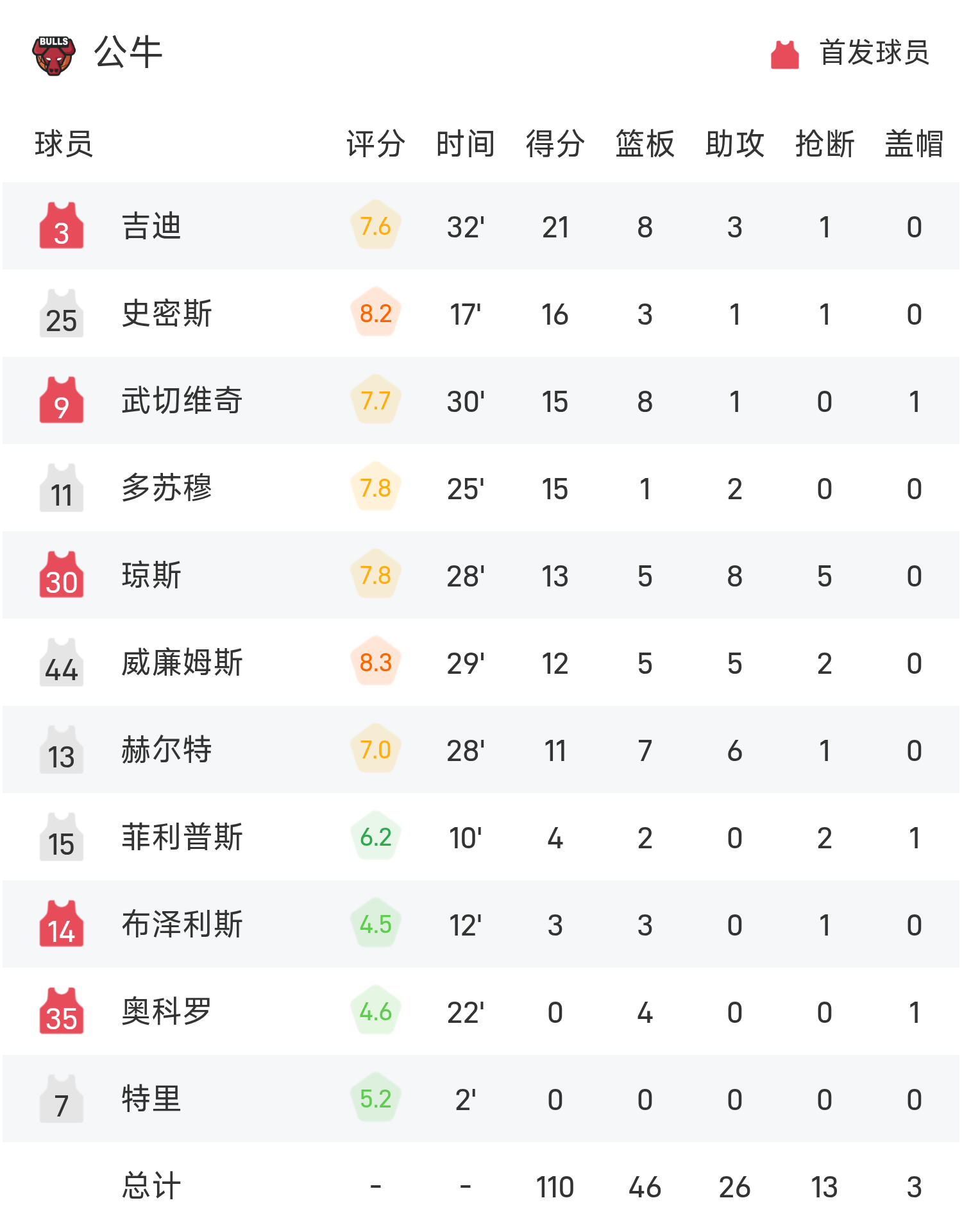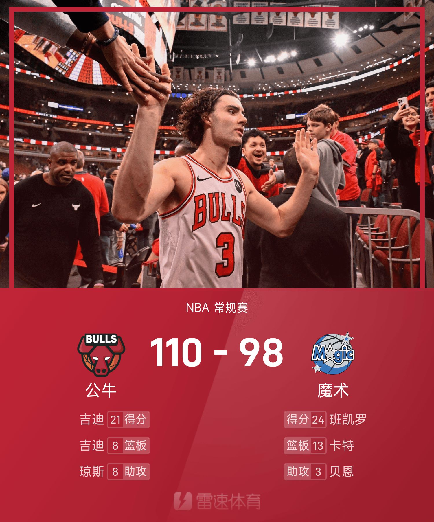 双方全场战罢,魔术98-110不敌公牛。