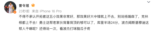 前CBA球员曾令旭发文点评:
