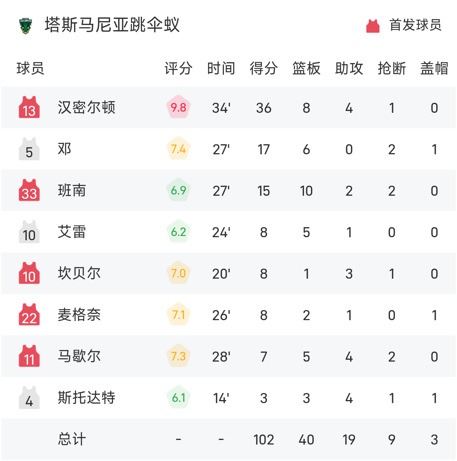 6686体育官网11月06日讯 25/26赛季NBL 常规赛,塔斯马尼亚跳伞蚁对阵东南墨尔本凤凰。双方全场战罢,塔斯马尼亚跳伞蚁102-103不敌东南墨尔本凤凰。索比得到28分3板4助率队取胜,汉密尔顿空砍全场最高的36分8板4助。
