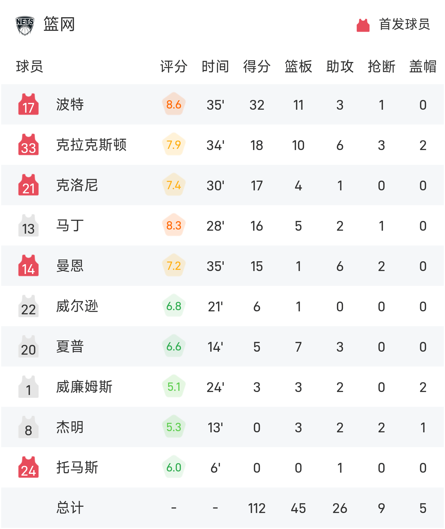 NBA战报:小波特32分10板,篮网112-103步行者